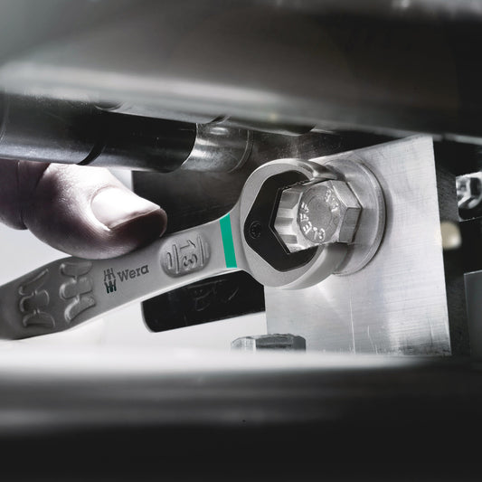 La Wera 6000 Joker es una llave combinada que incorpora un sistema de retención especial que evita que el tornillo o tuerca se deslice. Este mecanismo hace que el trabajo sea más cómodo y seguro, especialmente en posiciones complicadas. Además, su diseño incluye un ángulo de 30º que permite trabajar en espacios reducidos sin esfuerzo.