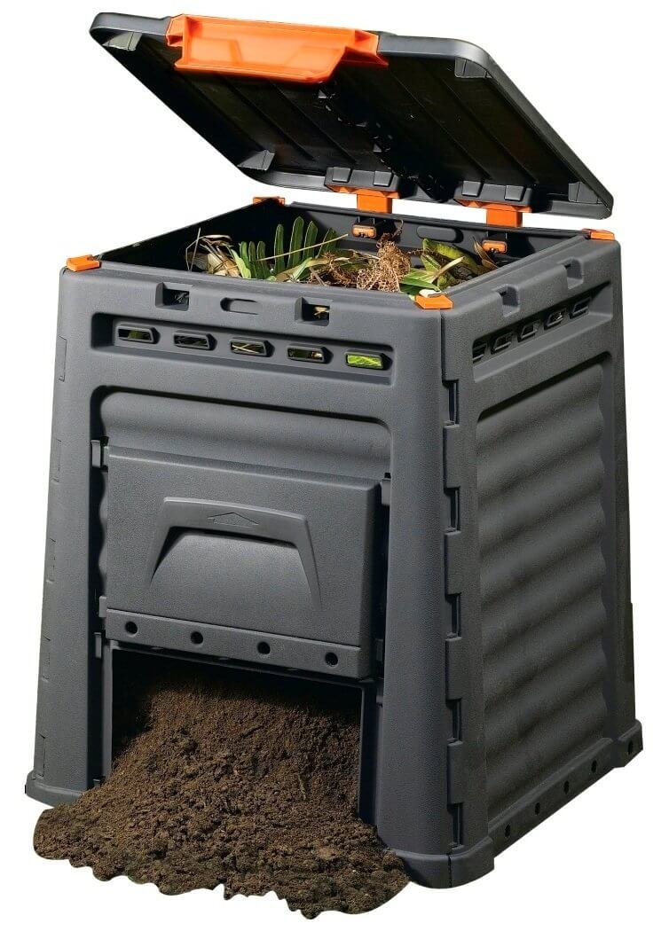 Este compostador exterior tiene una capacidad de 320 litros, no tiene base. El compostador ECO está fabricado con polipropileno inyectado y acabado liso que hace que sea resistente a las condiciones climáticas.