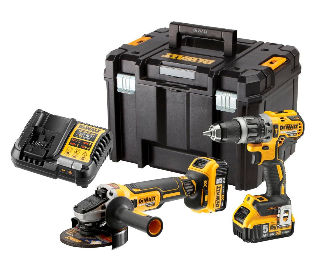 Completo kit Dewalt 18 V que incluye Taladro Percutor DCD796 + Amoladora DCG405 + 2 bat 5.0 Ah + Maletín TSTAK VI + Cargador DCB1104 18V, referencia DCK2080P2T