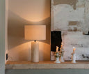 Lámpara decorativa Glow de Andrea House con base de travertino natural y pantalla de lino beige, diseñada para crear una luz suave y ambiental en salones, dormitorios o espacios de lectura. Su estética orgánica aporta calidez visual y textural a cualquier rincón del hogar.