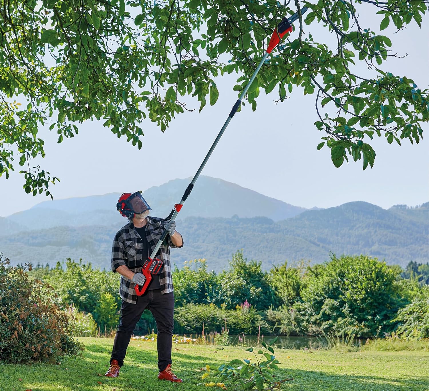 La podadora de pértiga con batería GC-LC 18/20 Li T-Solo de Einhell es perfectamente apropiada para el cuidado regular de árboles y arbustos más altos. Es miembro de la familia Power X-Change. Con una longitud de espada de 200 mm (espada y cadena de calidad OREGON) y una velocidad de corte de 5,5 metros por segundo se puede cortar las ramas sin problemas.