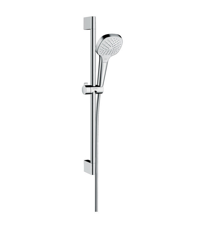 The Eco Smart shower set consists of a Croma Select E Vario hand shower, a Unica'Croma 0.65 m wall bar and a 1.60 m Isiflex shower hose, with a Rin, Turbo Rain, IntenseRain jet and a flow rate of 9l/min. Exclusive HANSGROHE technology such as the QuickClean or EcoSmart anti-limescale system, which guarantees water and energy savings.
