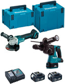 Combo kit with DGA504ZJ Mini Grinder and DHR243RTJ Light Hammer, both tools with BL brushless motor for better performance.
