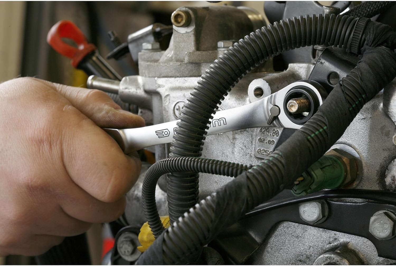 Compact and versatile ratcheting box-end wrench set, featuring two wrenches and a total of four metric sizes (8x10 mm, 12x13 mm, 16x17 mm, 18x19 mm). Perfect for keeping your briefcase compact without sacrificing functionality.