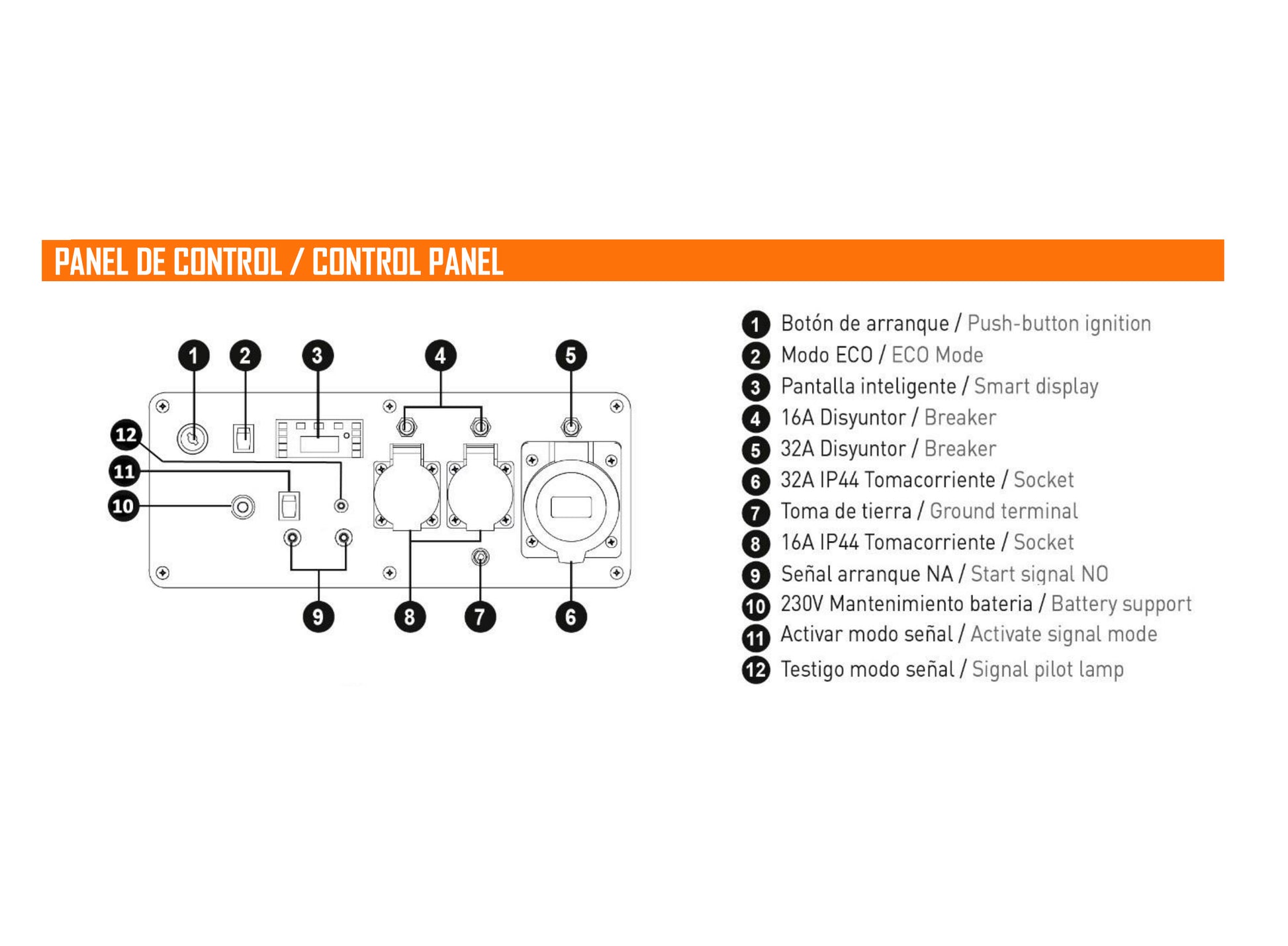 • Smart digital display : Provides information on voltage, frequency, hours of use, fuel, and battery charge status; it also indicates when to require maintenance.