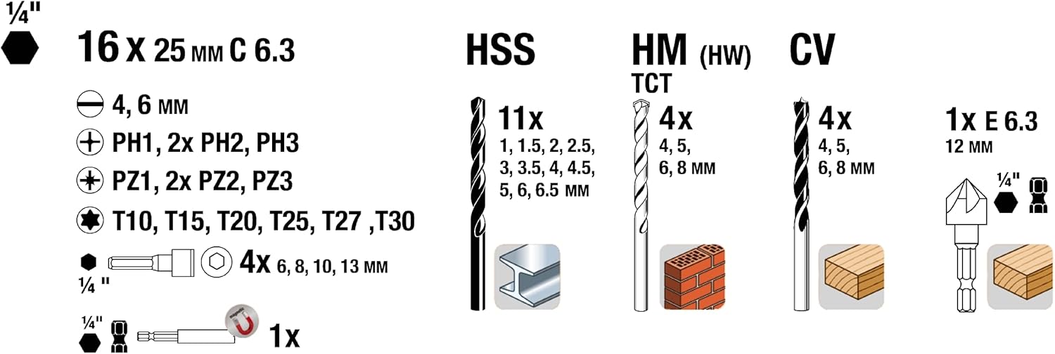 This set is the perfect complement to cordless screwdrivers, rechargeable drills, and corded drills, offering a comprehensive solution for a wide range of drilling and screwdriving tasks.