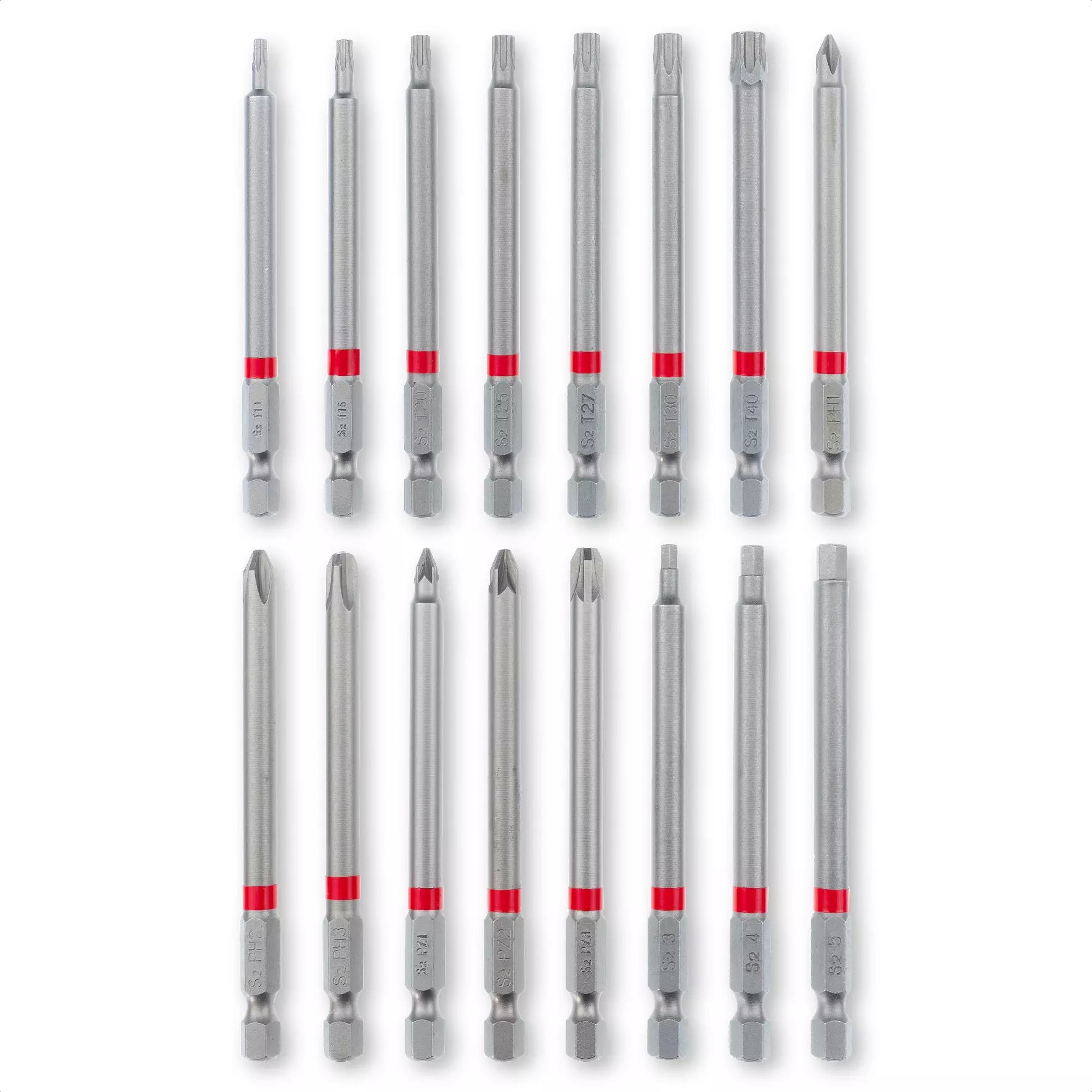 16 bits, each 90 mm long , made of sandblasted S2 steel, known for their strength and durability. The bits include: