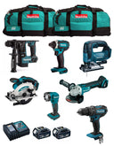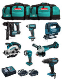 The Makita kit contains DHP482 Hammer Drill + DHR171 Hammer + DGA504 Mini-Grinder + DTD152 Impact Driver + DJV182 Jigsaw + DSS610 Circular Saw + DML815 Led Flashlight + 2bat 5Ah BL1850B + DC18RC charger + 2 bags with LXT600 wheels