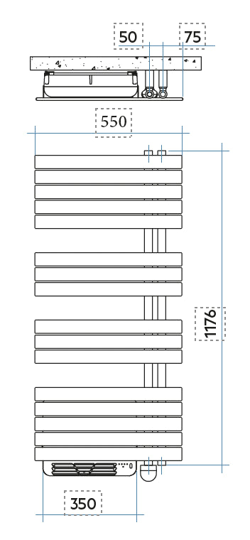 Electric radiator with booster. The radiator is filled with a cooling liquid and is combined with a 1000 watt electrical power amplifier system. This system provides a uniform temperature in the room where it is installed. SOUL_S Air Electric is available in 3 heights and a width of 550 mm.